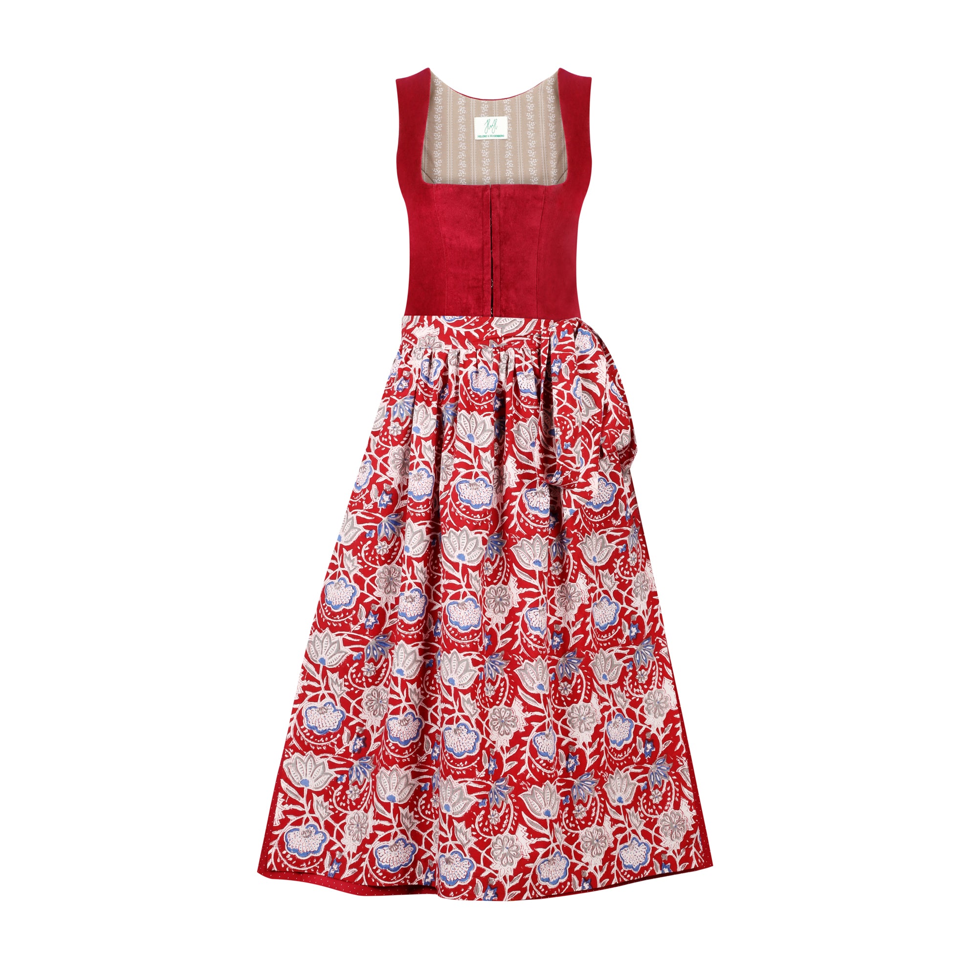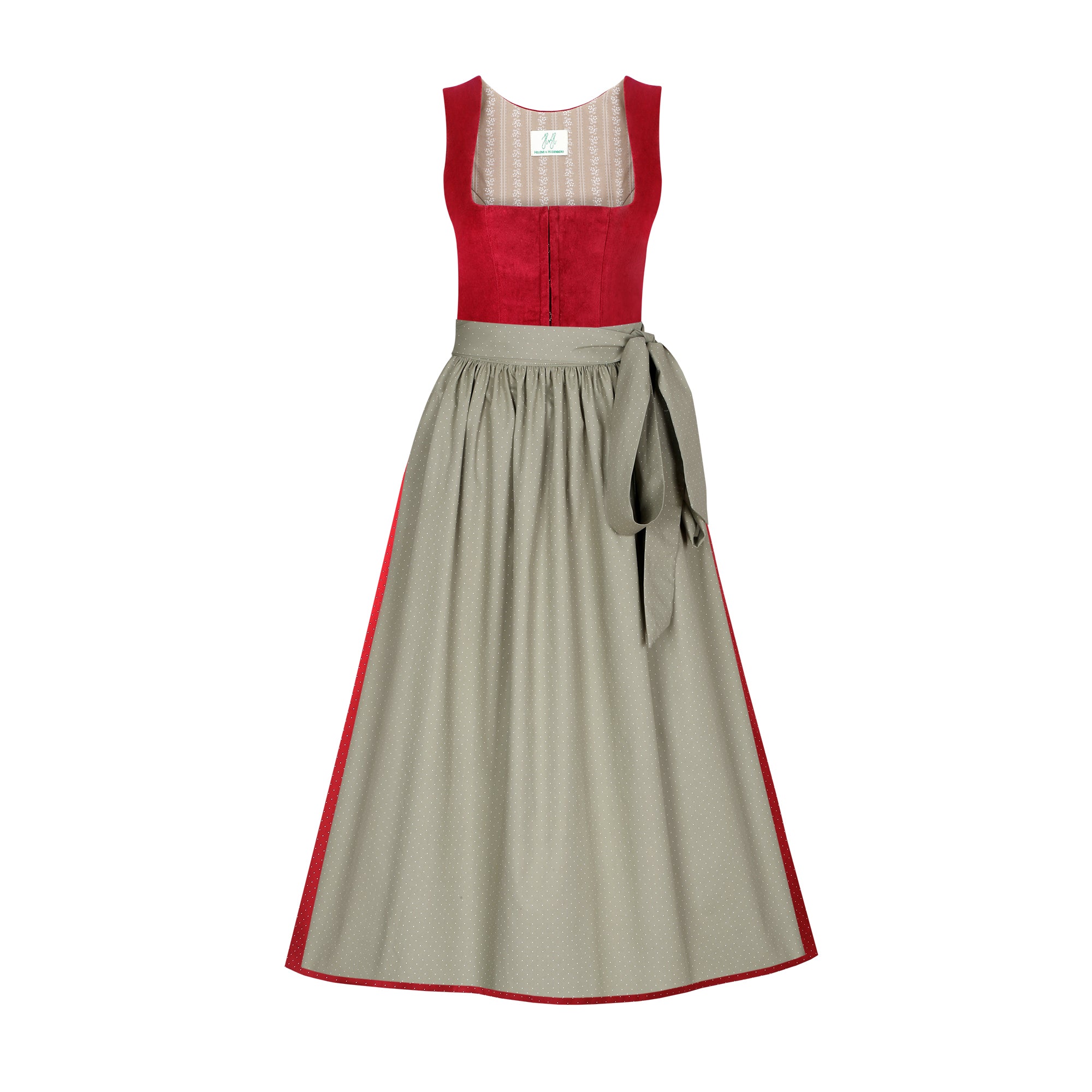 Das Dirndl n° 355 ist Teil der Winter Kollektion 2023. Das Samt Mieder aus kräftigem Bordeaux Rot mit einem getupften Baumwollrock. Das Dirndl kann mit einer schlichten Oliv Farbenen Baumwollschürze oder der farblich abgestimmten Dirndlschürze n° 1416 aus der India Kollektion bestellt werden.