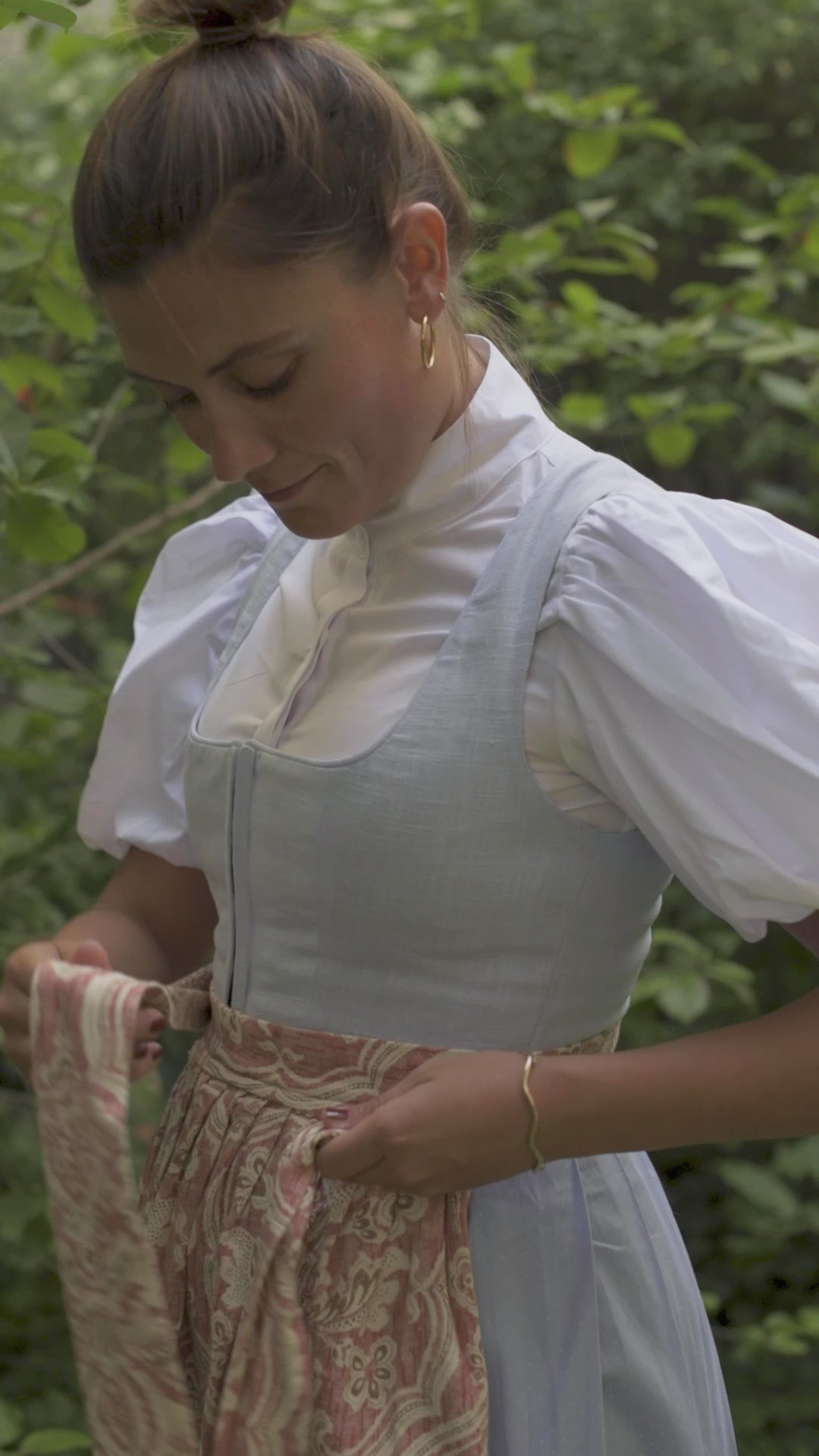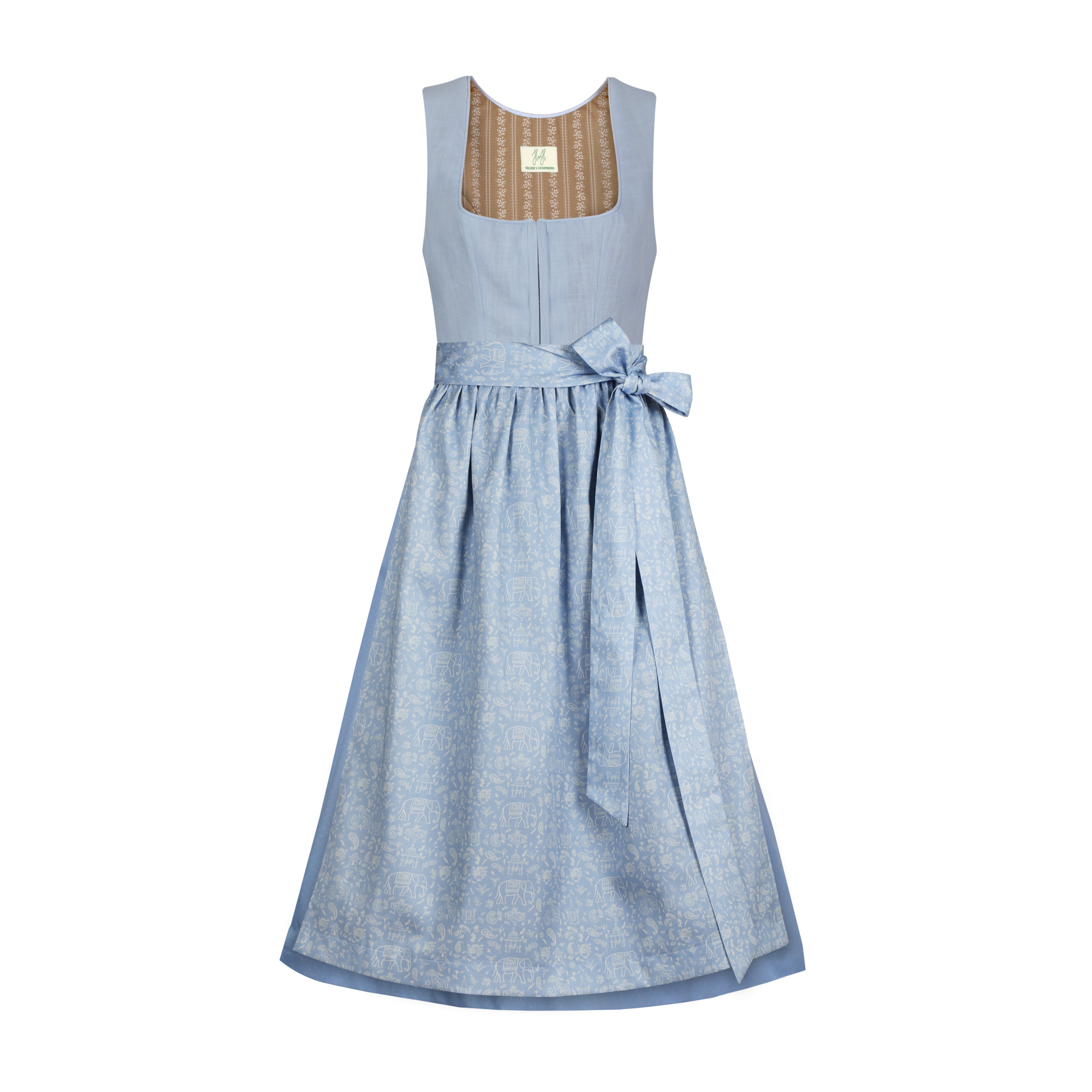 Unser klassischer Schnitt von Dirndl N°358 erstrahlt nun in einem hellen Blau. Der frische und elegante Blau-Ton ist besonders vielfältig zu tragen. Ob mit auffälliger Schürze mit Großwild Print oder einer Ton-in-Ton Variante für einen dezenten und feinen Auftritt, die bewährte Passform aus hochwertigem Leinen steht für zeitlose Eleganz.