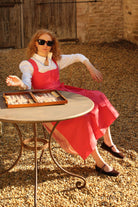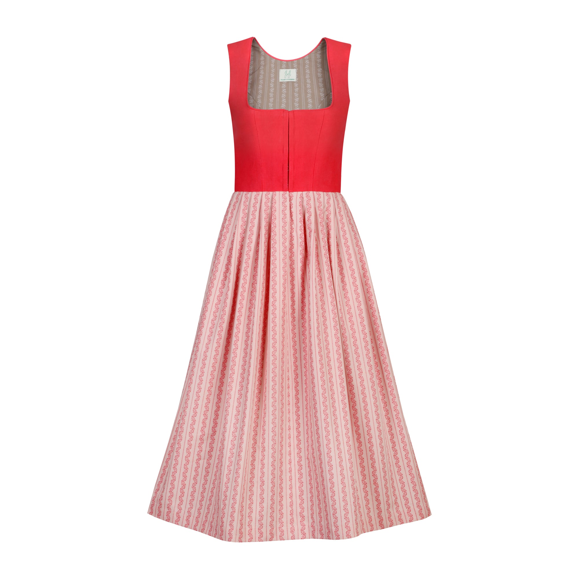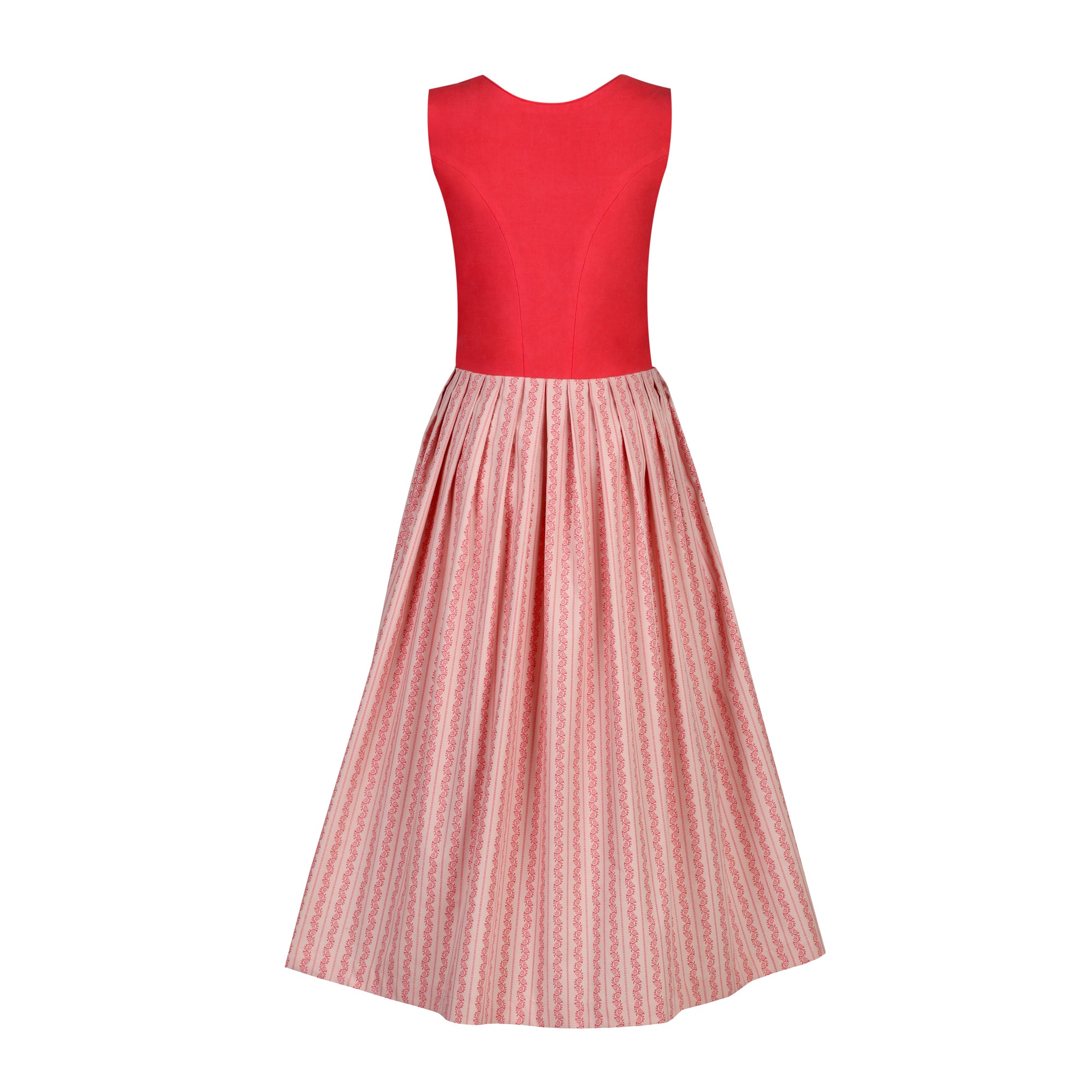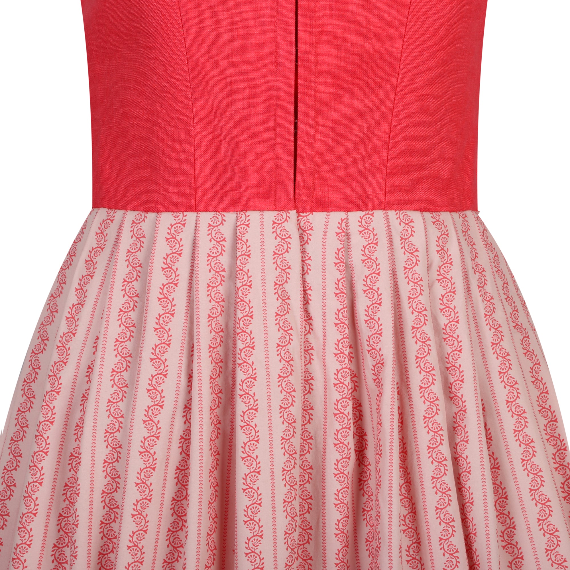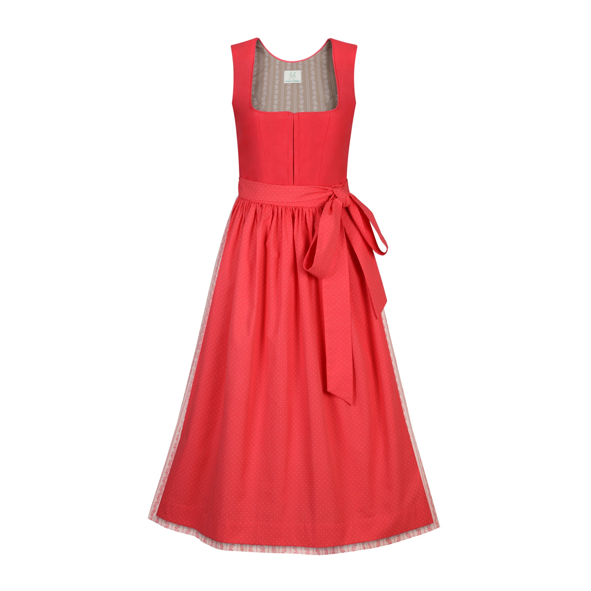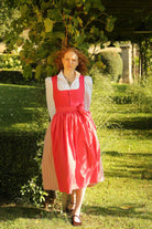 Das Dirndl n° 7 hat ein Korall Farbenes Leinen Mieder mit einem Altrosa Baumwollrock mit Blumenranke und einer Korall Farbenen Dirndlschürze aus Baumwolle.