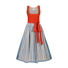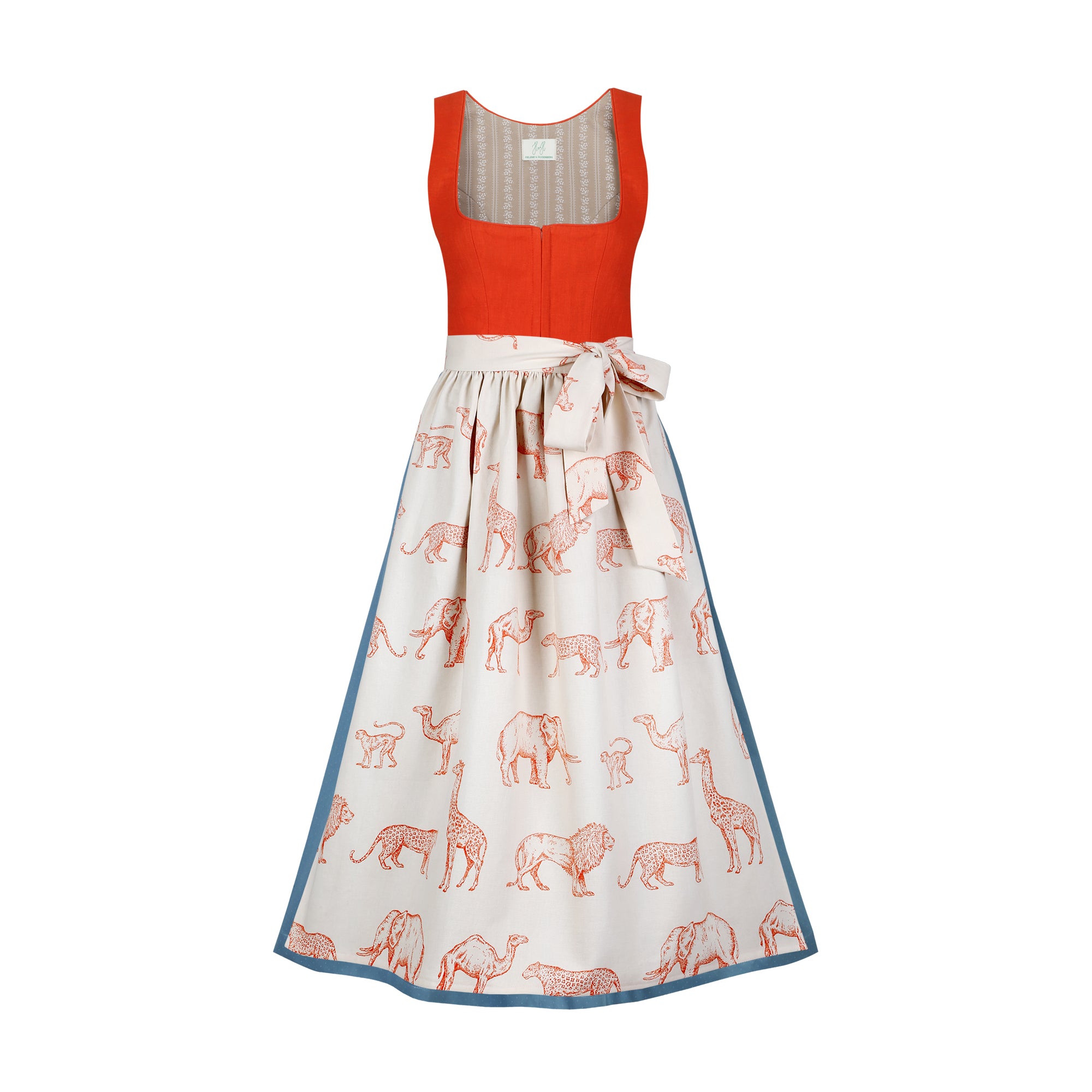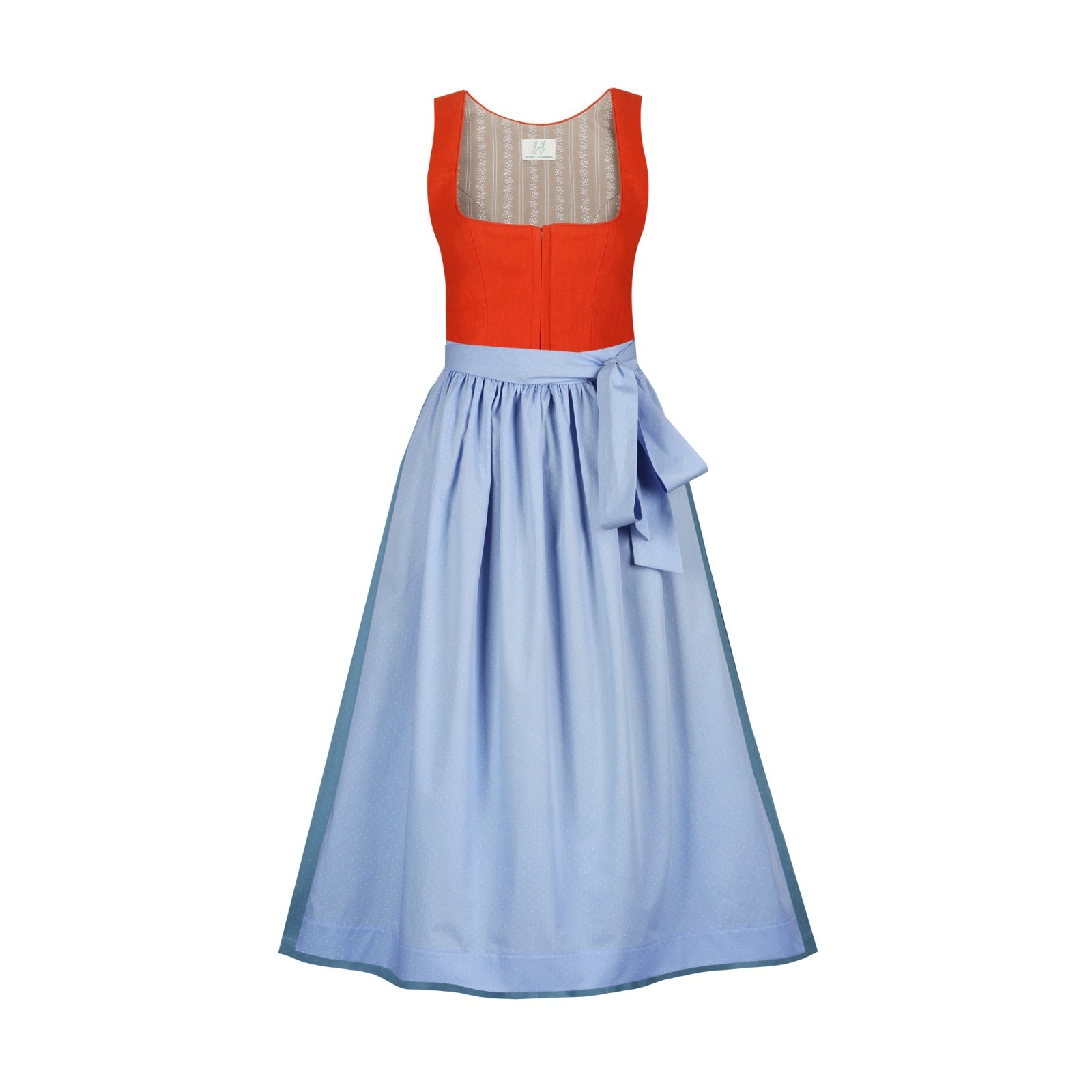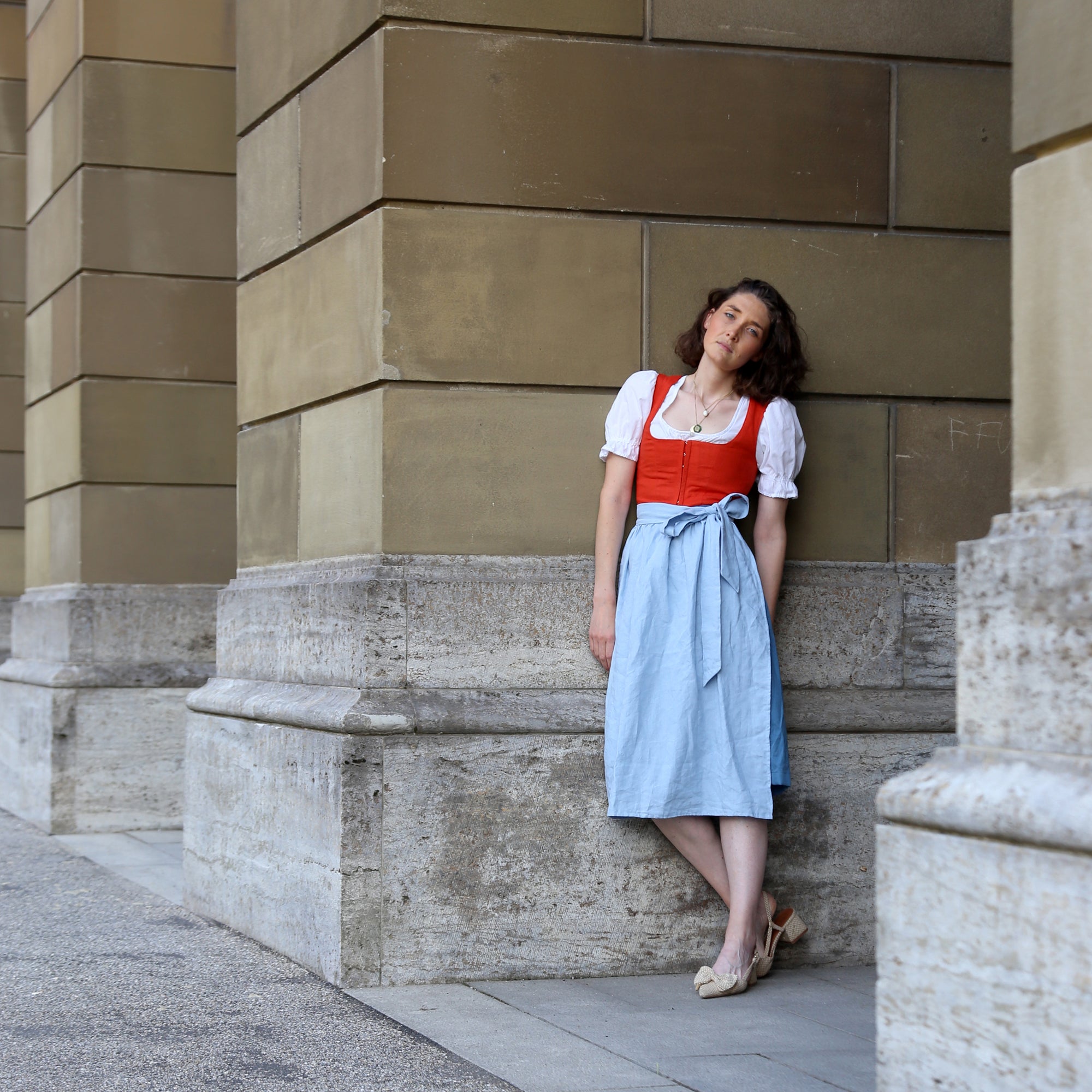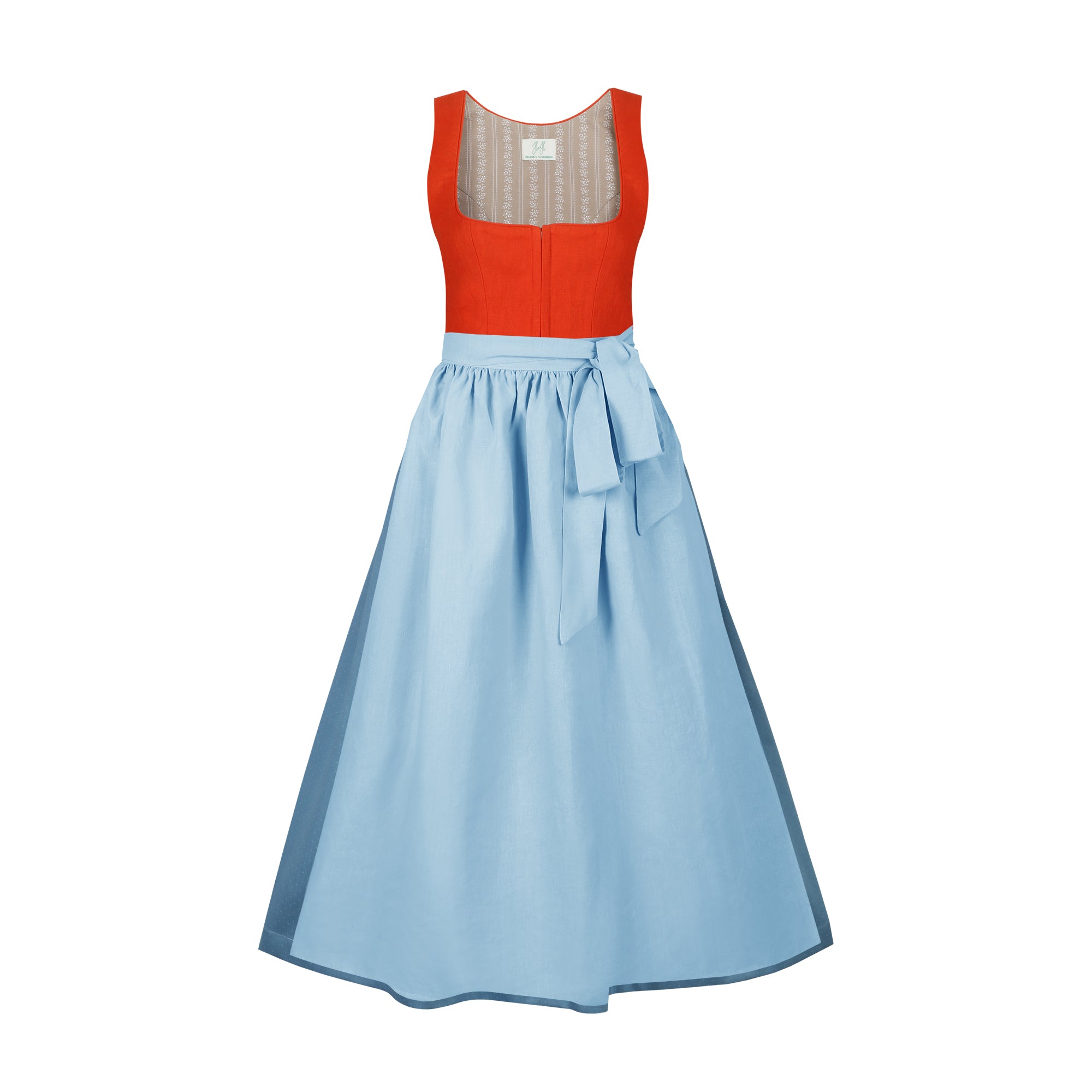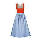 Das Dirndl n° 44 ist Teil der neuen Basic Kollektion. Das Leinen Mieder ist in einem kräftigen Orange und der getupfte Baumwollrock in Blau. Das Dirndl lässt sich perfekt kombinieren mit einer hellblauen Baumwollschürze oder einer der gemusterten Dirndlschürze.