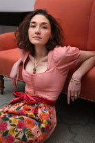 Dirndlschürze n°379 im farbenfrohen Blumenmuster mit Schürzenbändern aus pinkem Samt. Eine erfrischende Ergänzung zum einfarbigen Dirndl.