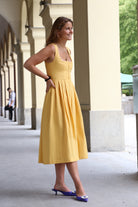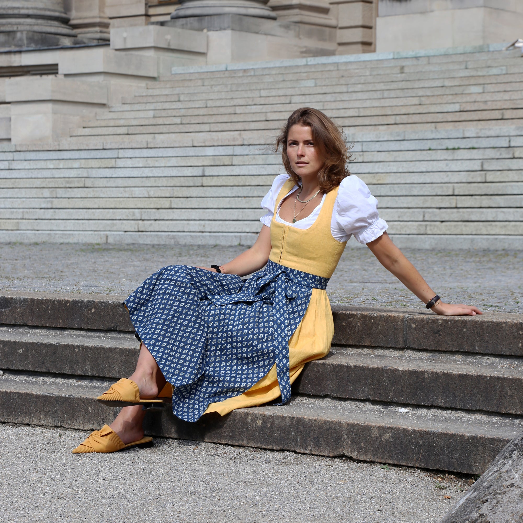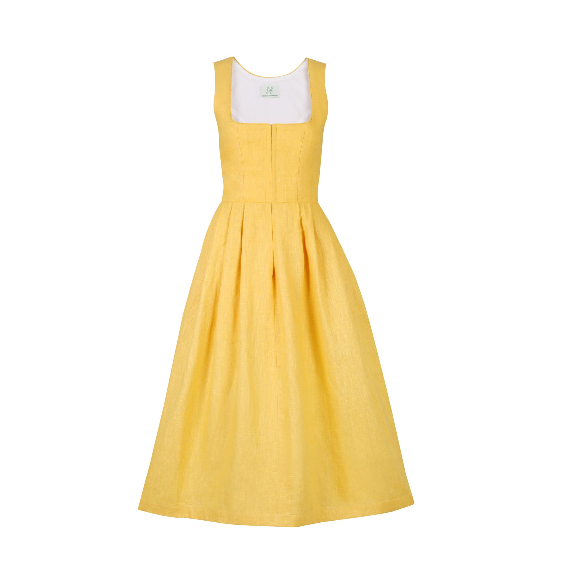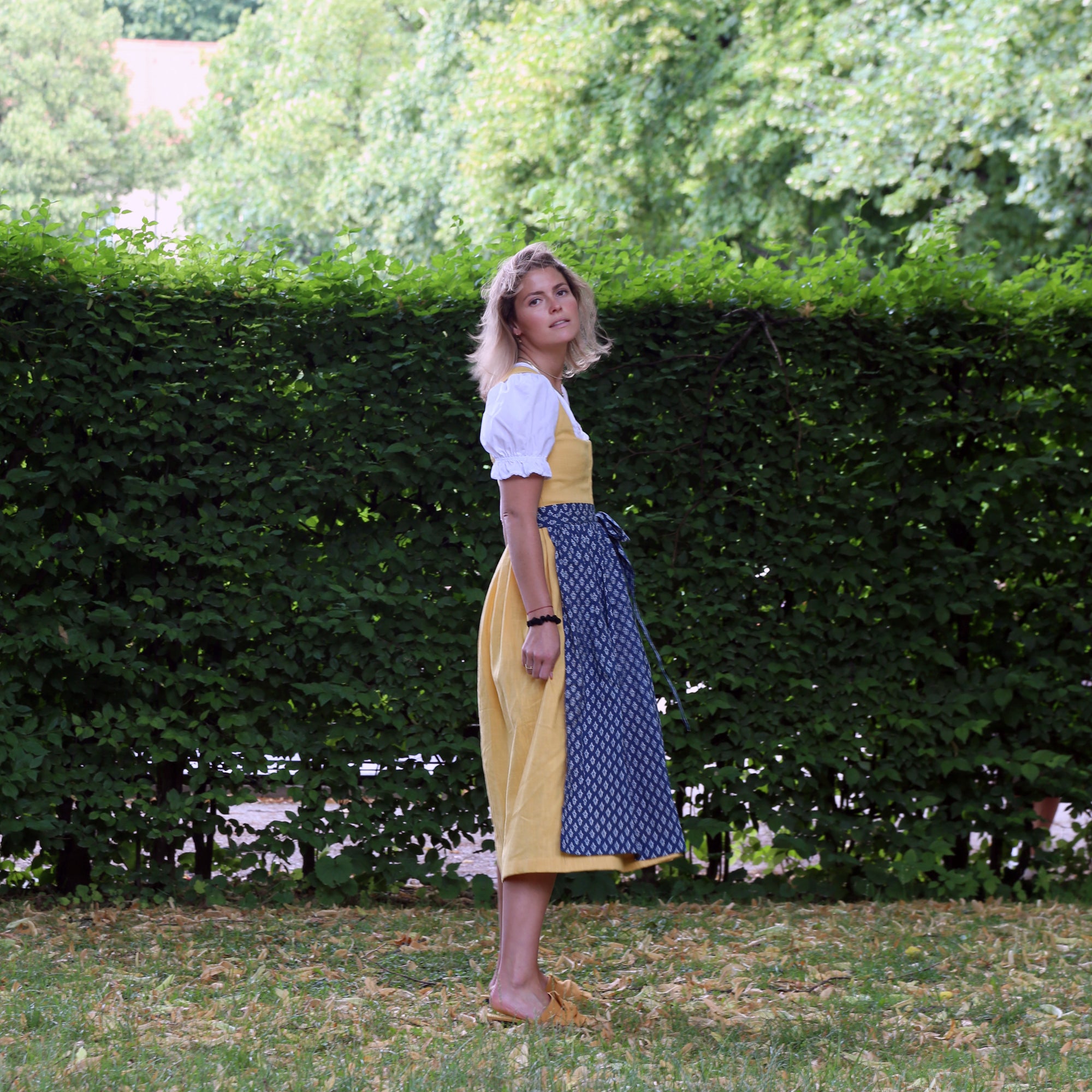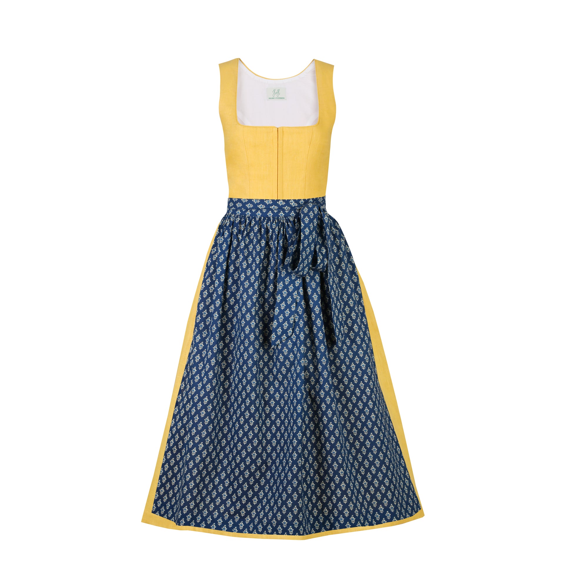 Das Dirndl n°34 ist Teil der neuen Basic Kollektion. Sowohl das Mieder als auch der Rock sind aus einem Leinenstoff in Gelb. Das Dirndl kann sowohl mit einer Schürze als auch als Kleid zu einem Sommerfest oder Hochzeitsempfang getragen werden.